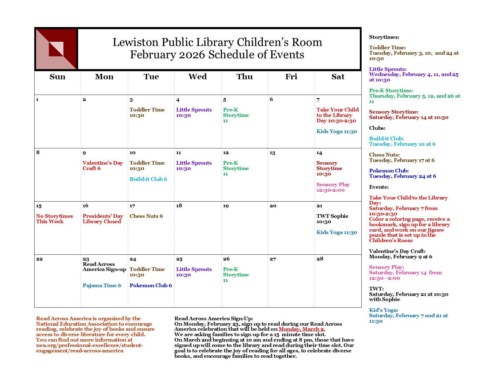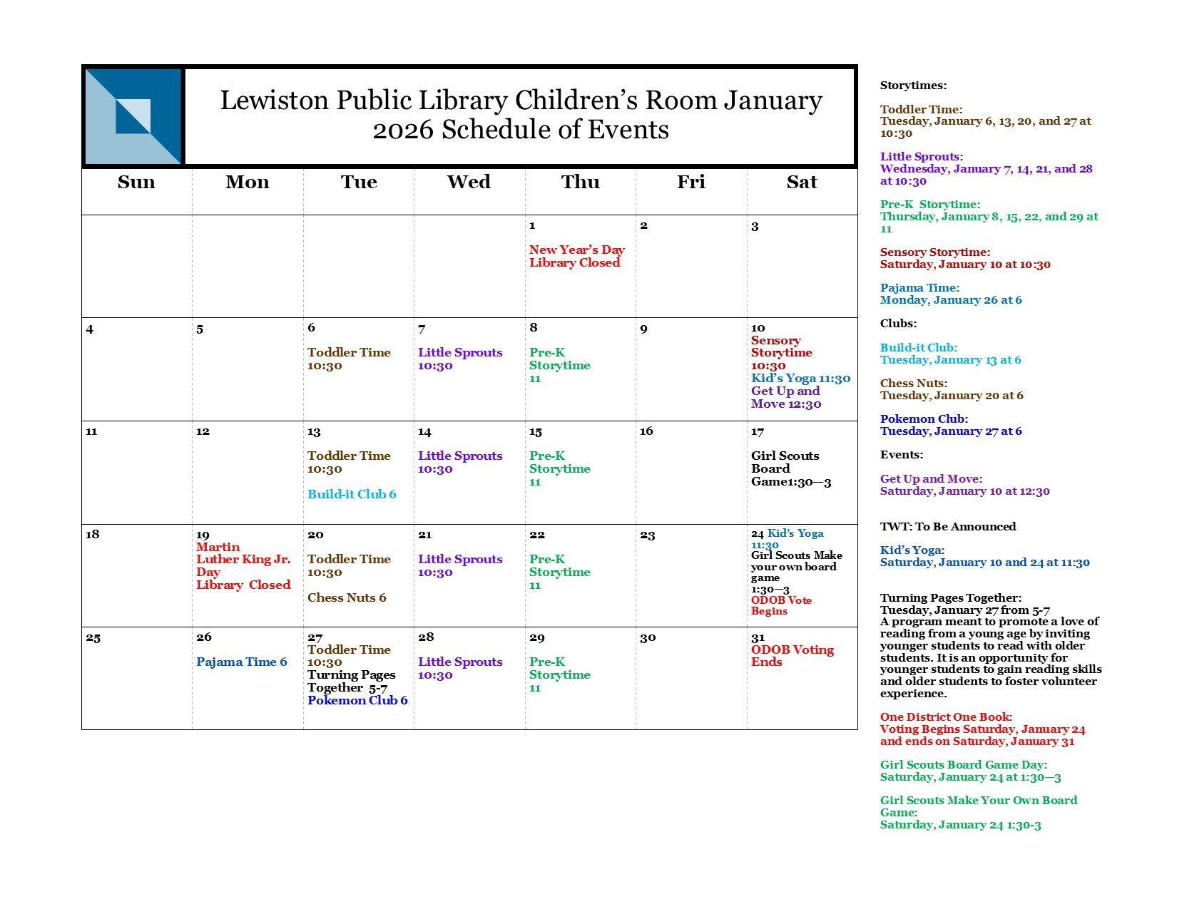 Pre-K Storytime is cancelled for Thursday, January 29. We are very sorry for any inconvenience.